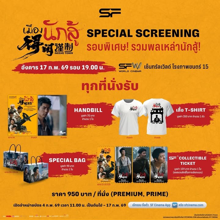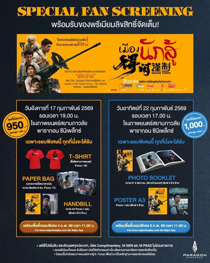 สัมผัสความละเมียดละไมในการสร้างของ “Gezhi Town – เมืองนักสู้” ในรอบดูก่อนใคร 17 กุมภาพันธ์นี้ เวลา 1 ทุ่มตรงที่ สยามภาวลัย พารากอน ซีนีเพล็กซ์ และ SF World Cinema โรงที่ 15 , รอบ Fanscreen วันที่ 22 กุมภาพันธ์ เวลา 5 โมงเย็น พร้อม “ของที่ระลึก” สุด Exclusive เพื่อ “คนรักเซียวจ้าน” โดยเฉพาะอาทิ เสื้อยืด, แฮนด์บิลล์, โปสเตอร์,โฟโต้บุ๊ค, Collectible Ticket ฯลฯ และรอบปกติเริ่ม 26 กุมภาพันธ์นี้เป็นต้นไป